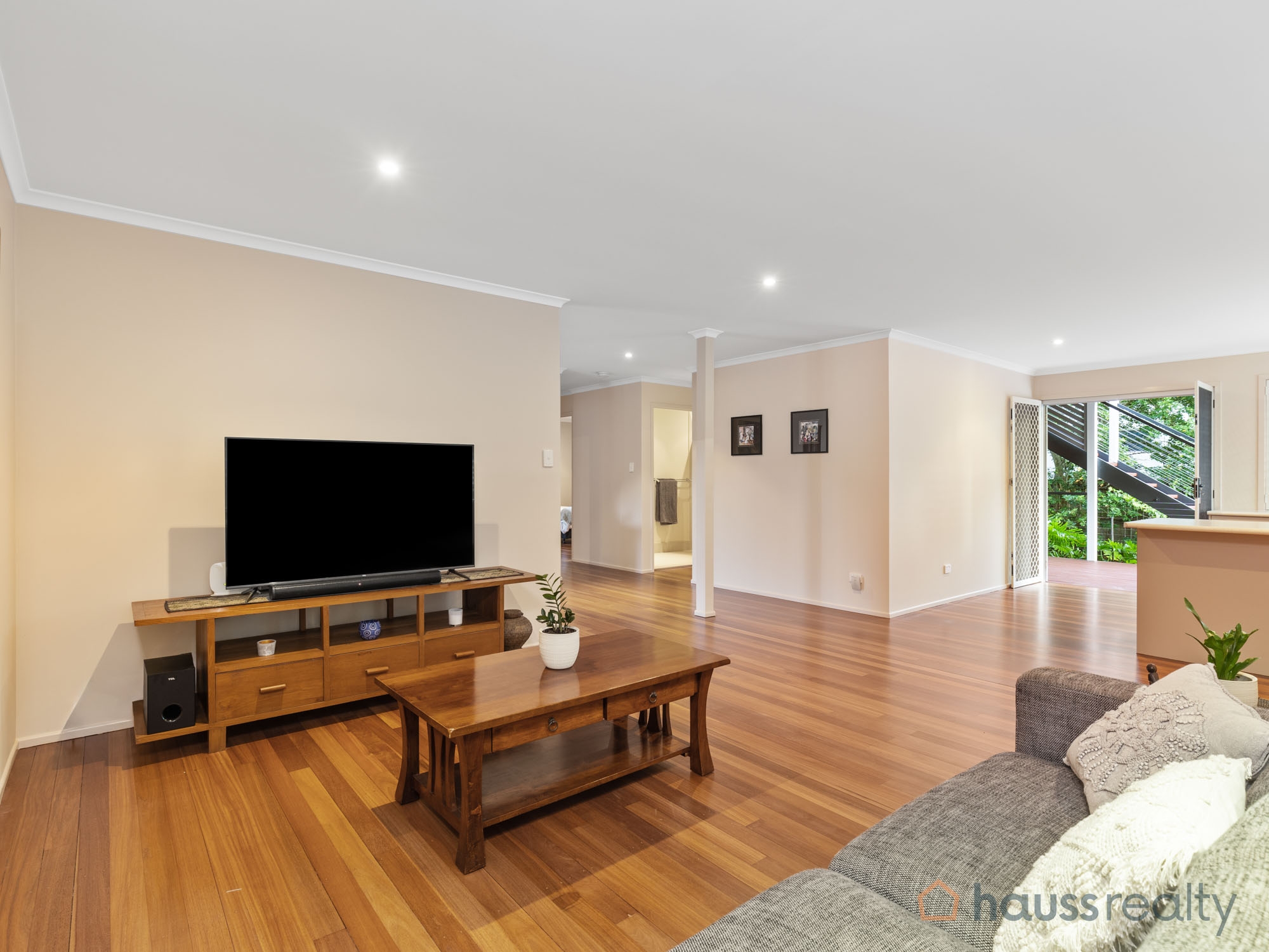 The upper level is a central hub for everyday life with a generous lounge/TV room with polished timber floors, air-conditioning, and sliding doors leading to the rear deck. It’s the perfect place to unwind with views of the yard and pool.
